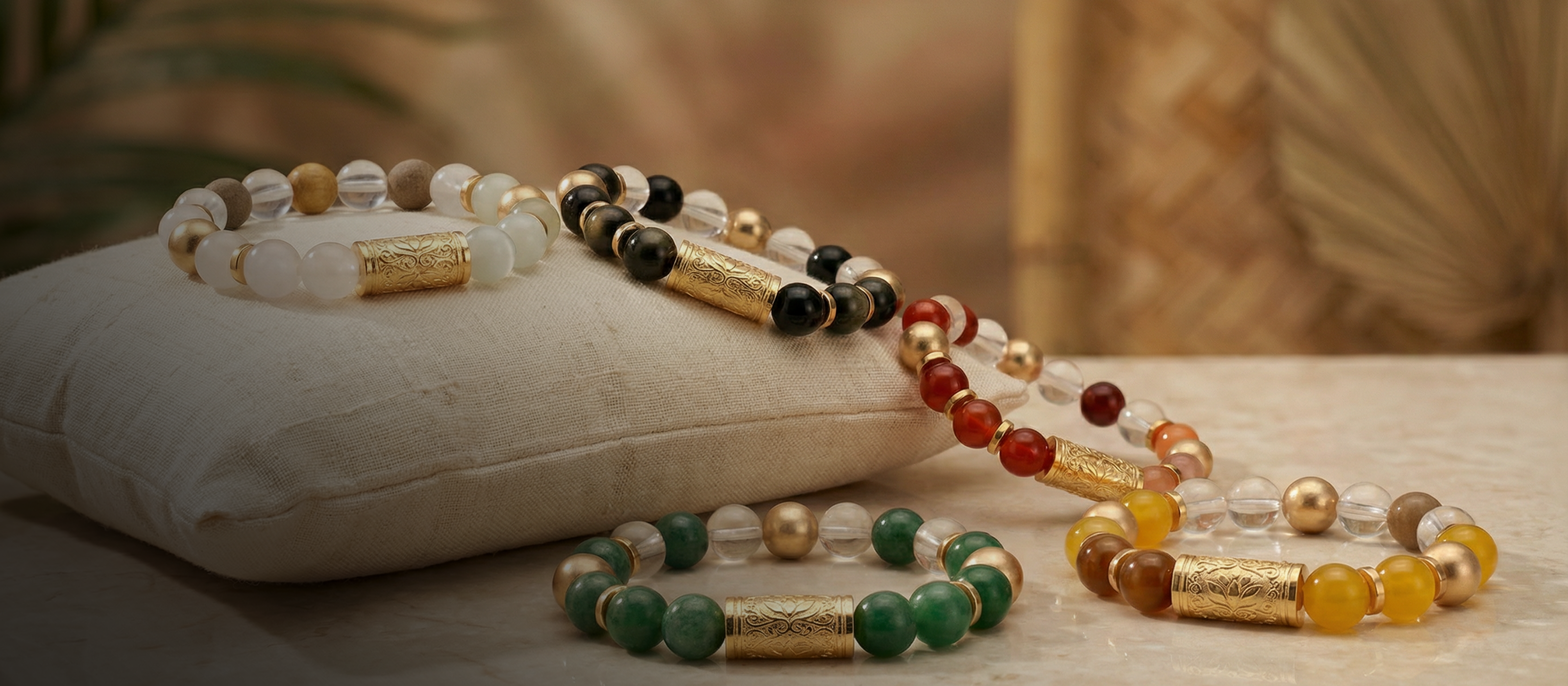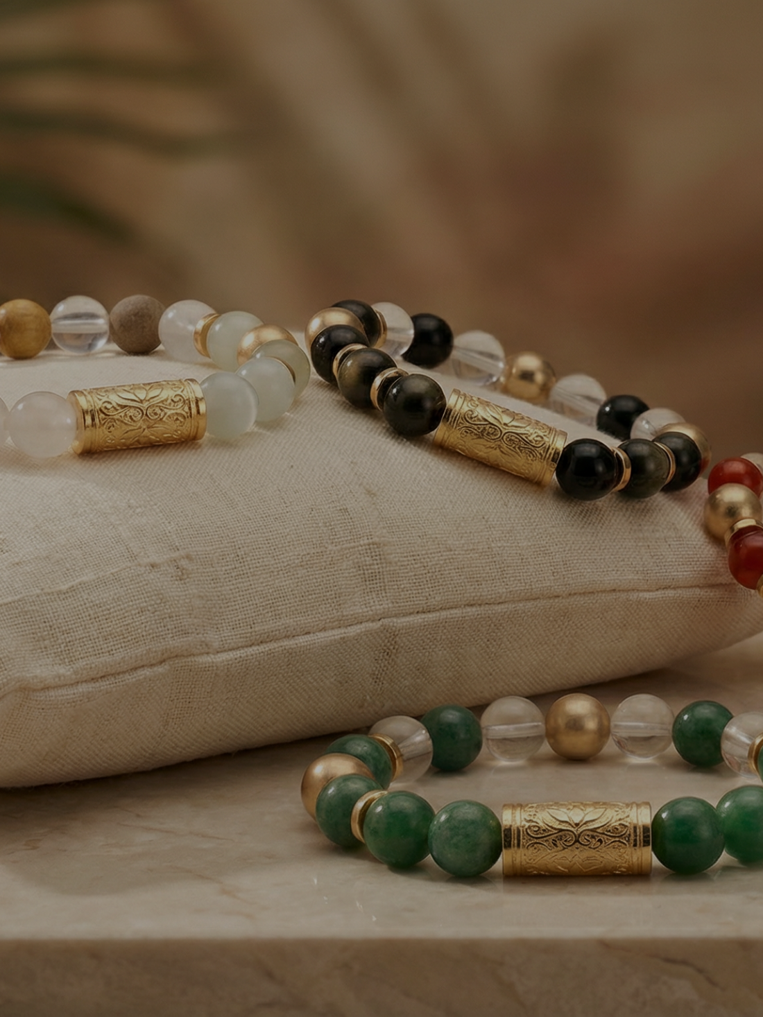 Each bracelet reflects its element—earth, water, fire, forest, or metal—through color and structure.